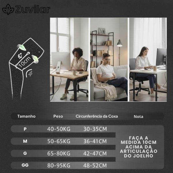 Compressão eficaz que ajuda na circulação e no suporte muscular, mesmo após longos períodos sentado.